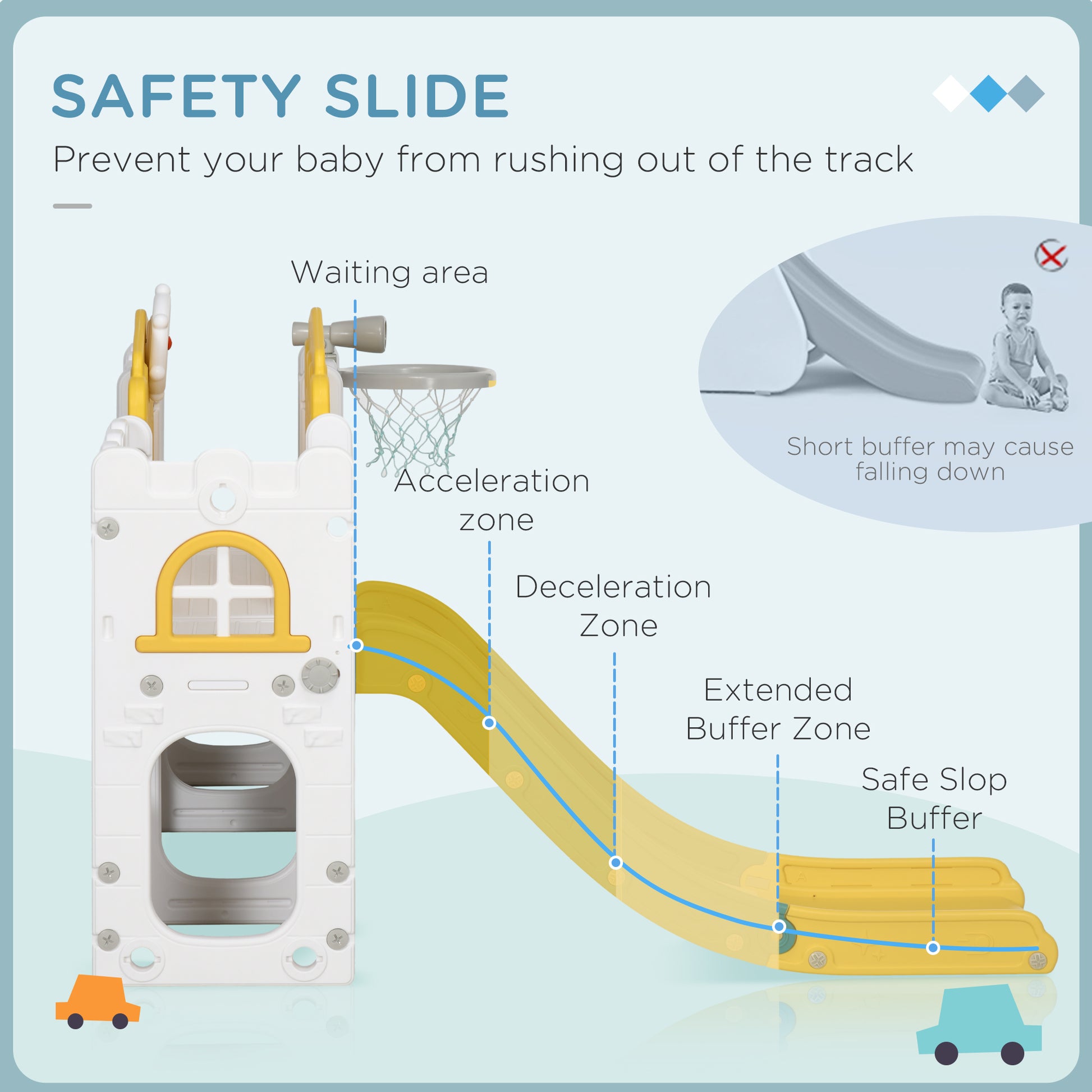- Slide's acceleration and deceleration zones for safe sliding, whilst the buffer zone minimises impact at the slide's end