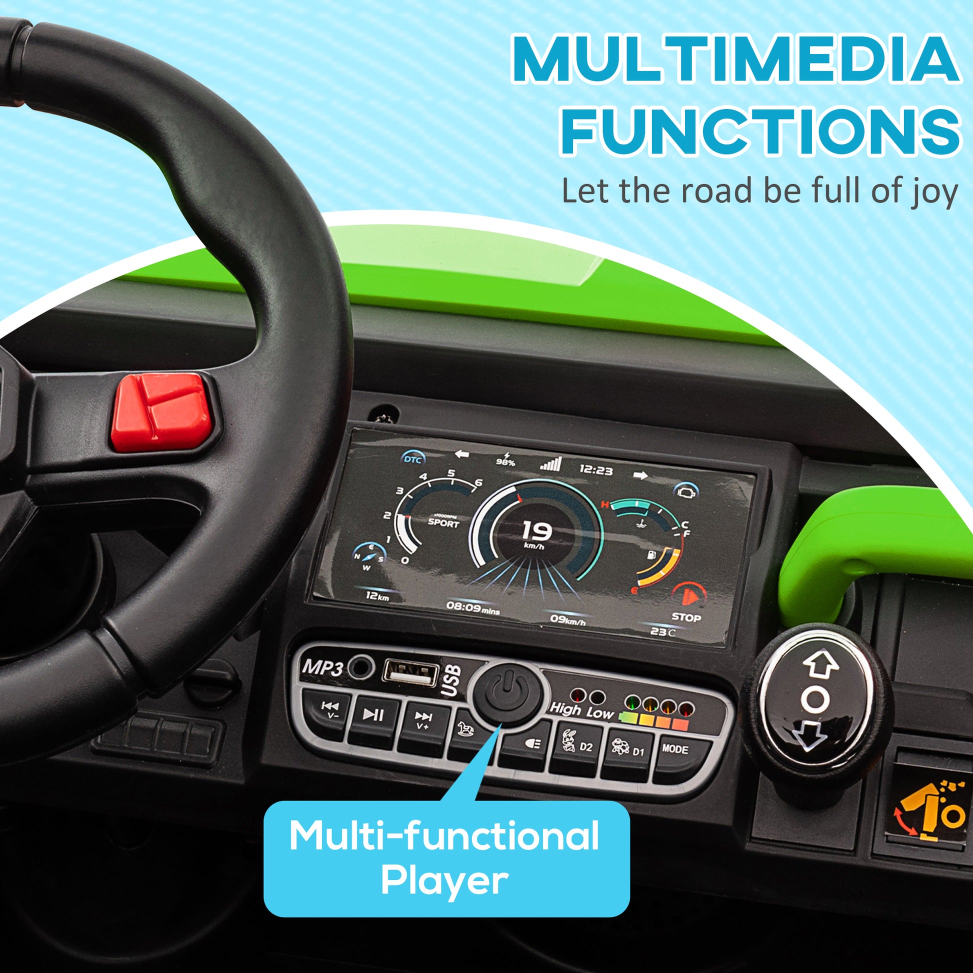 With this HOMCOM electric ride-on, kids will feel all the joys of driving. It's a two-seater, so they can bring friends along and enjoy the fun together. Capable of going up to 6km/h, this kids ride on utv features a music player, LED headlights and a horn – just like the real thing. The remote control lets parents get involved and control the electric UTV, so no people misses out on the enjoyment.