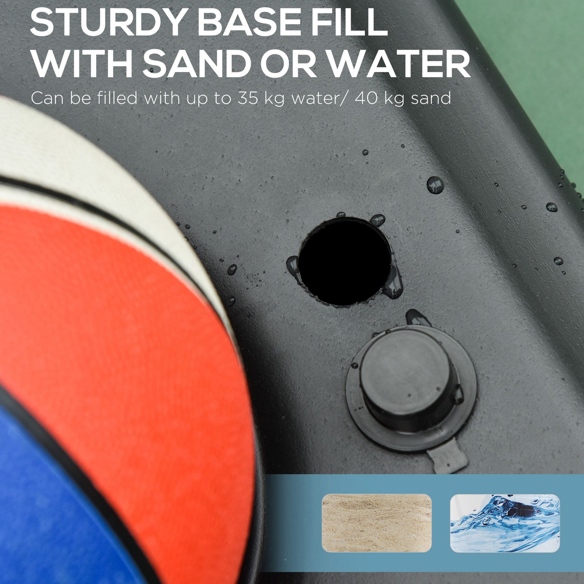 - Bottom base can be filled with 35kg of water, 40kg of sand or 45kg of water and sand, giving the base added stability