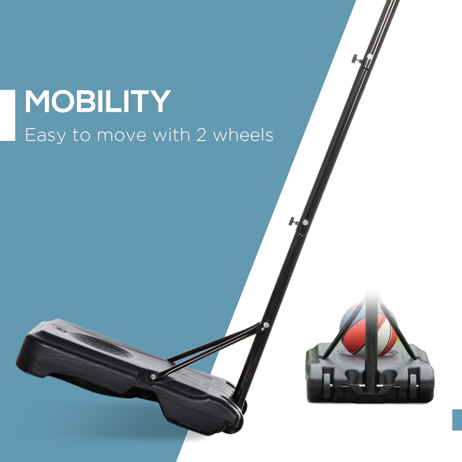 Enjoy shooting hoops with this HOMCOM basketball stand. With an adjustable height, it's suitable for all ages – everyone can join the fun. A steel frame for strength and durability, whilst the base can be filled with water or sand, keeping it firmly in place. Wheels at the bottom lets you move the stand with ease, so you can position it properly. Play on your own or with friends and family; either way, you'll enjoy the swooshing sound of the ball passing through the net.