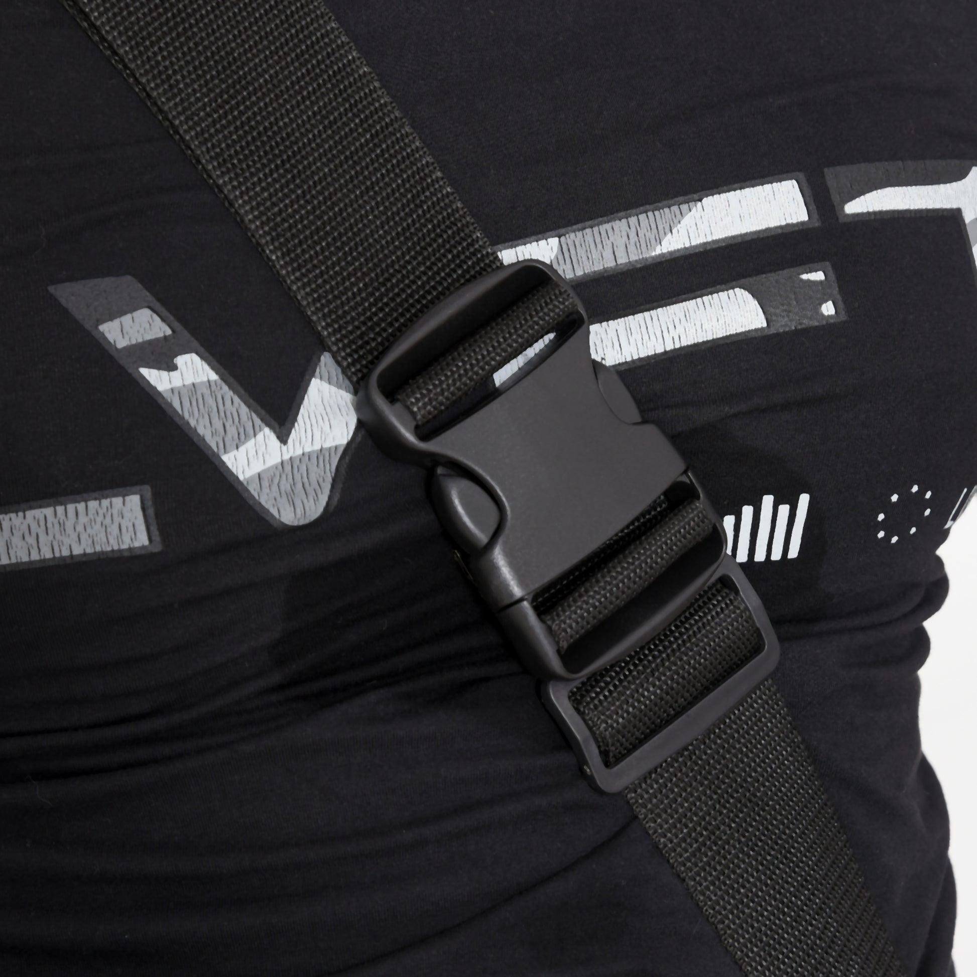 - Safe design features foam shoulder pads, foam foot rests, safety belt, side hand-bars to hold on