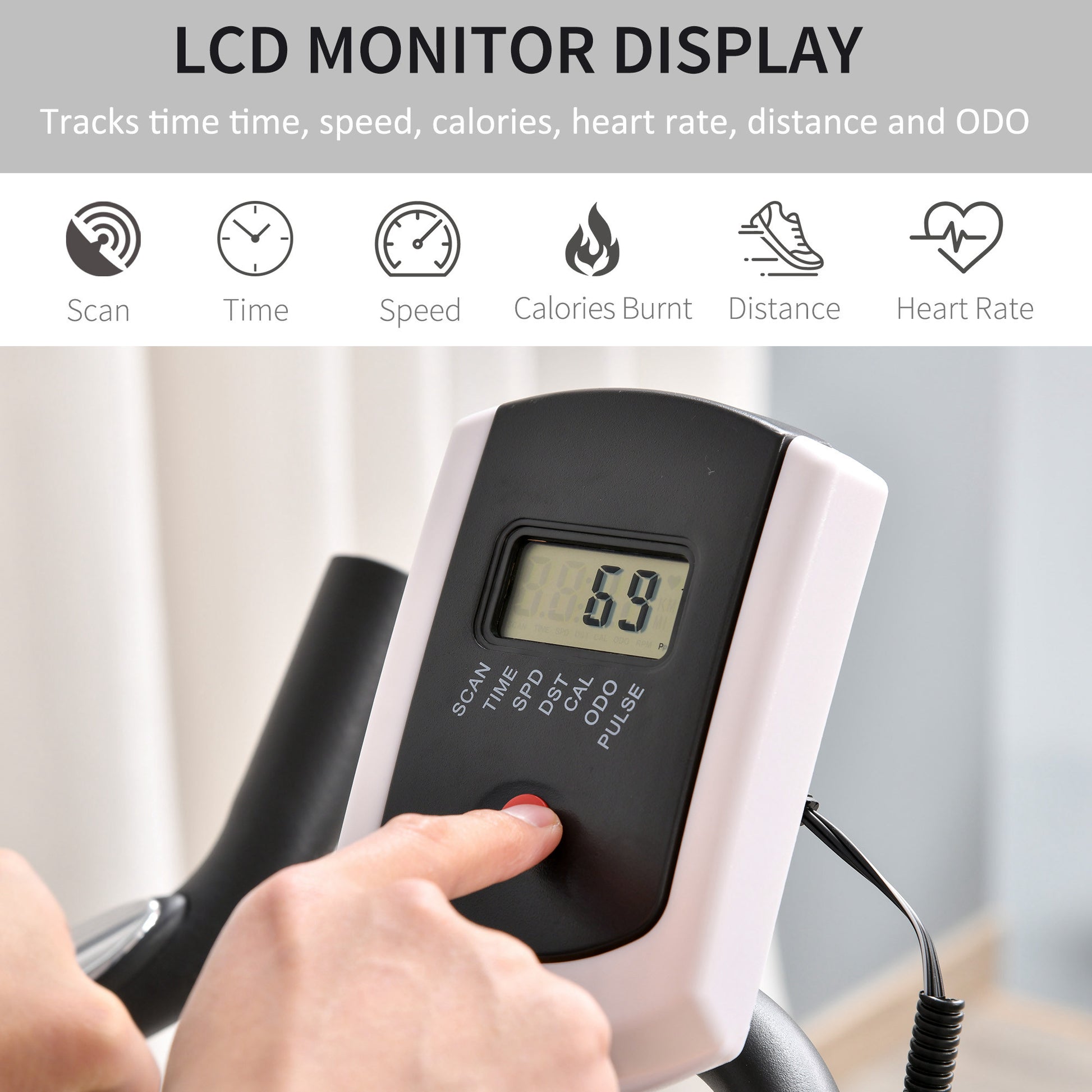 - LCD display tracks time, distance, heart rate, speed and calories burnt