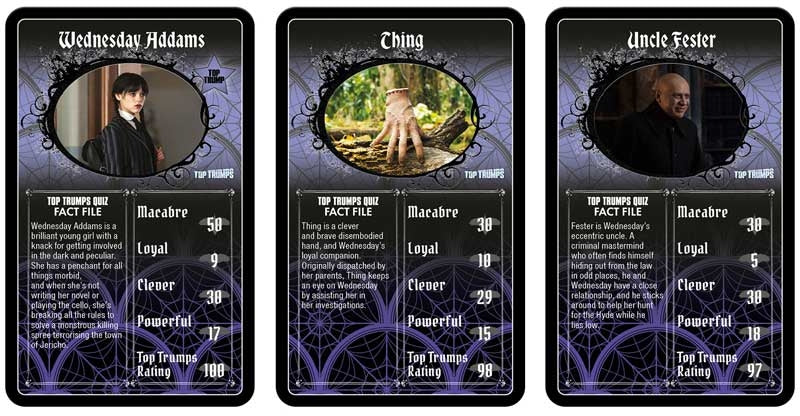 Welcome to the world of the dark and twisted. This card game has taken a wickedly fun turn. The amazing Netflix tv show, Wednesday has now become your new favourite Top Trumps game! With 30 of your favourite characters including the scarily intelligent Wedensday Addams, Enid Sinclair, and Thing you can now challenge your friends to find out who is the Top Trump! Choose from categories like Macabre, Loyal, Clever and Powerful. Will your opponents out-smart you? This game is perfect for Wednesday fans. Grab this deck and play your way to success!