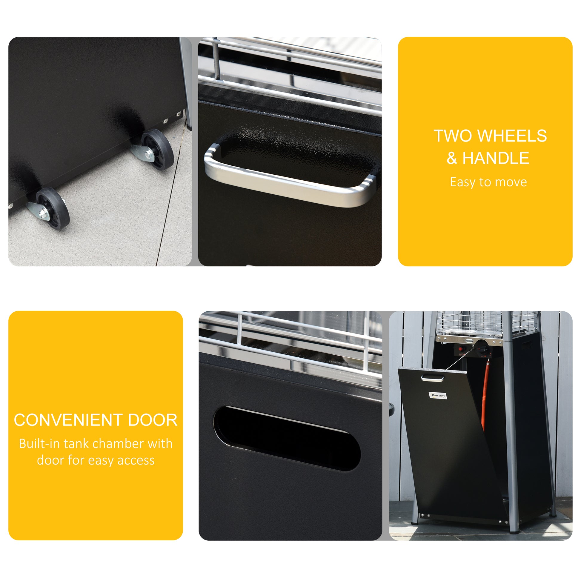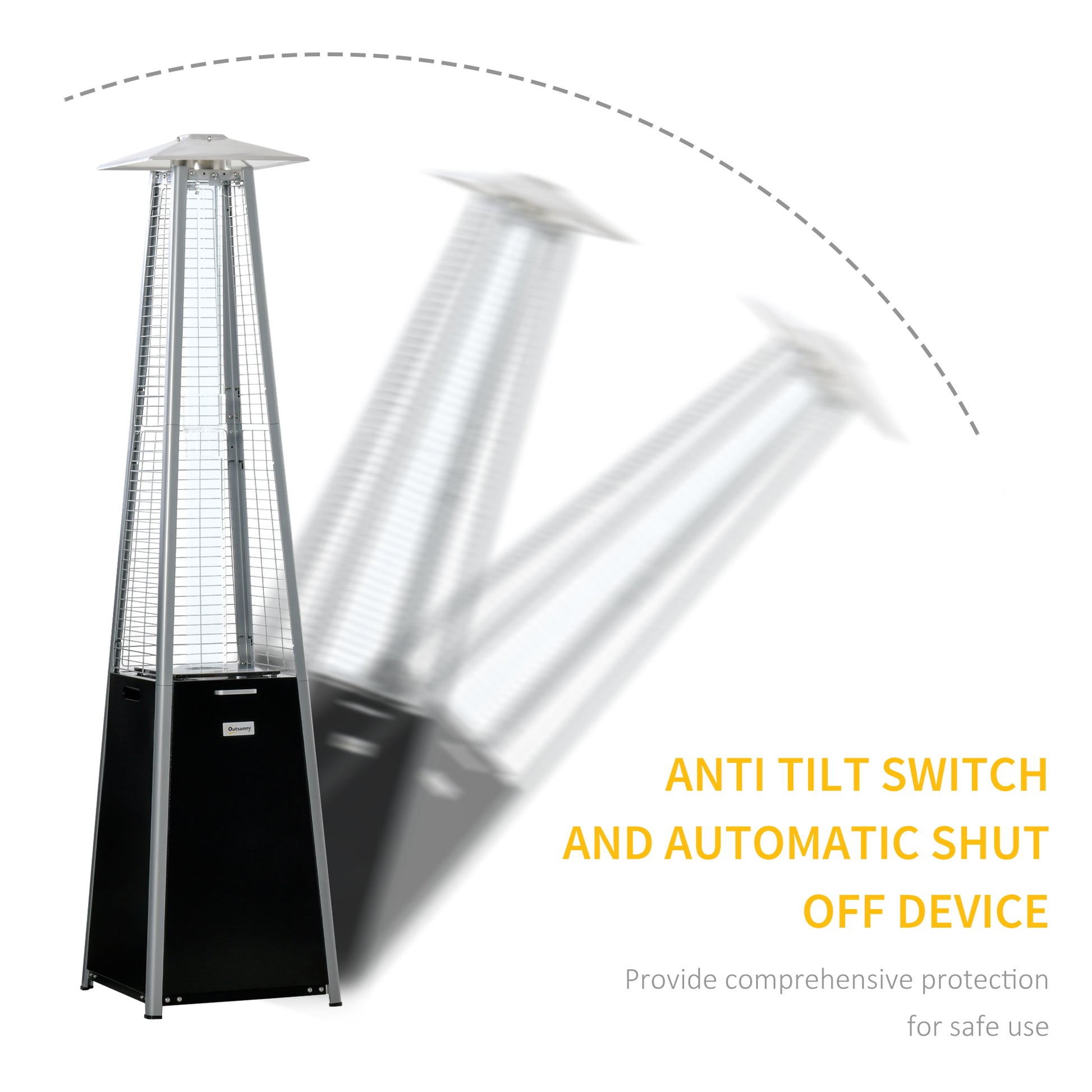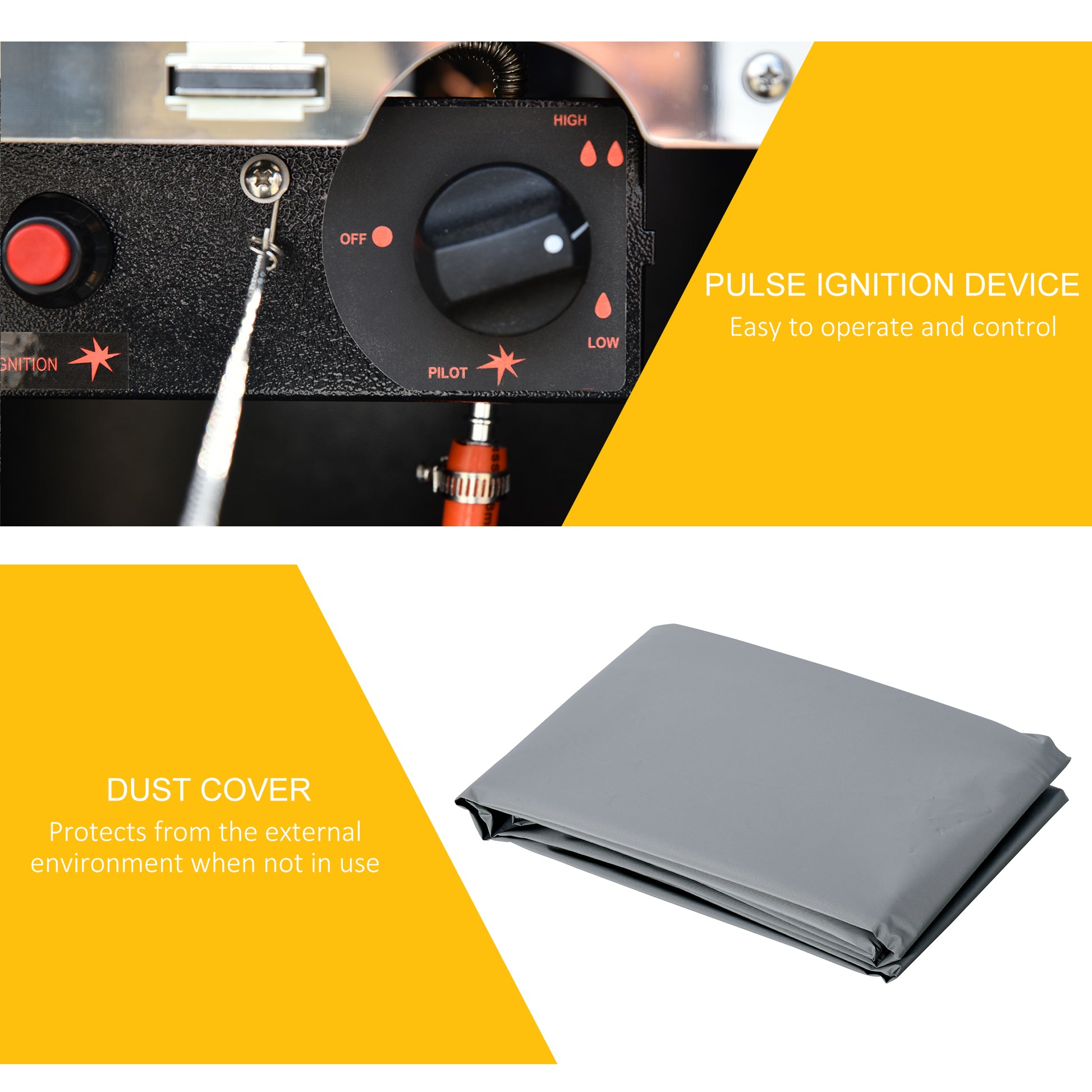 This Outsunny gas outdoor heater keeps you warm and cosy when the outside temperature is cold. The shell made from selected material, it is tough and durable for extended use, with a cover included to keep it protected when off. Where the flame comes out, there is a glass cover and netting to safely protect you from harm. The outdoor gas heater comes with a control knob, so you're kept at the perfect temperature. The pyramid patio heater is finished with wheels to move around easily.