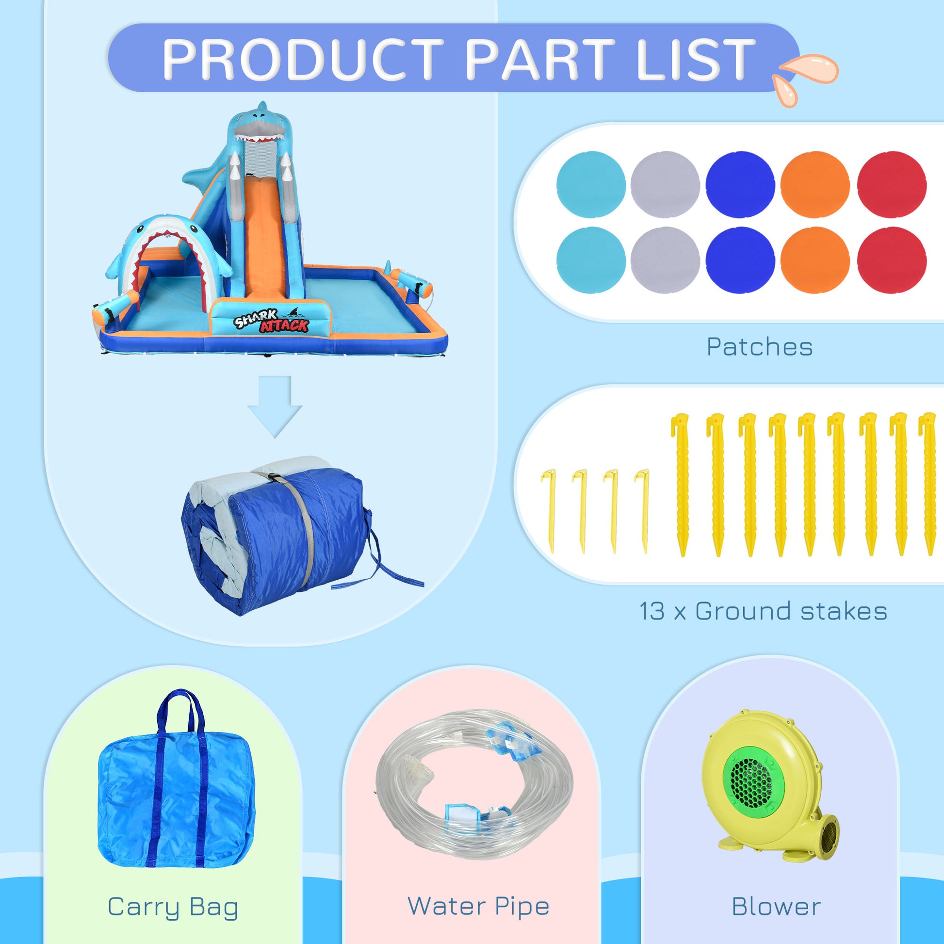 Create your very own water park, where fun is unlimited. Thanks to this Outsunny bouncy castle, there's so much for children to do – it's nearly impossible to get bored. Big enough for four children at once, it's great for playdates and parties. Ground stakes keep the castle securely to the ground, suitable for outdoor use. It takes a few minutes to inflate with the electric air blower, ready to transform your space into a fun-packed playground.