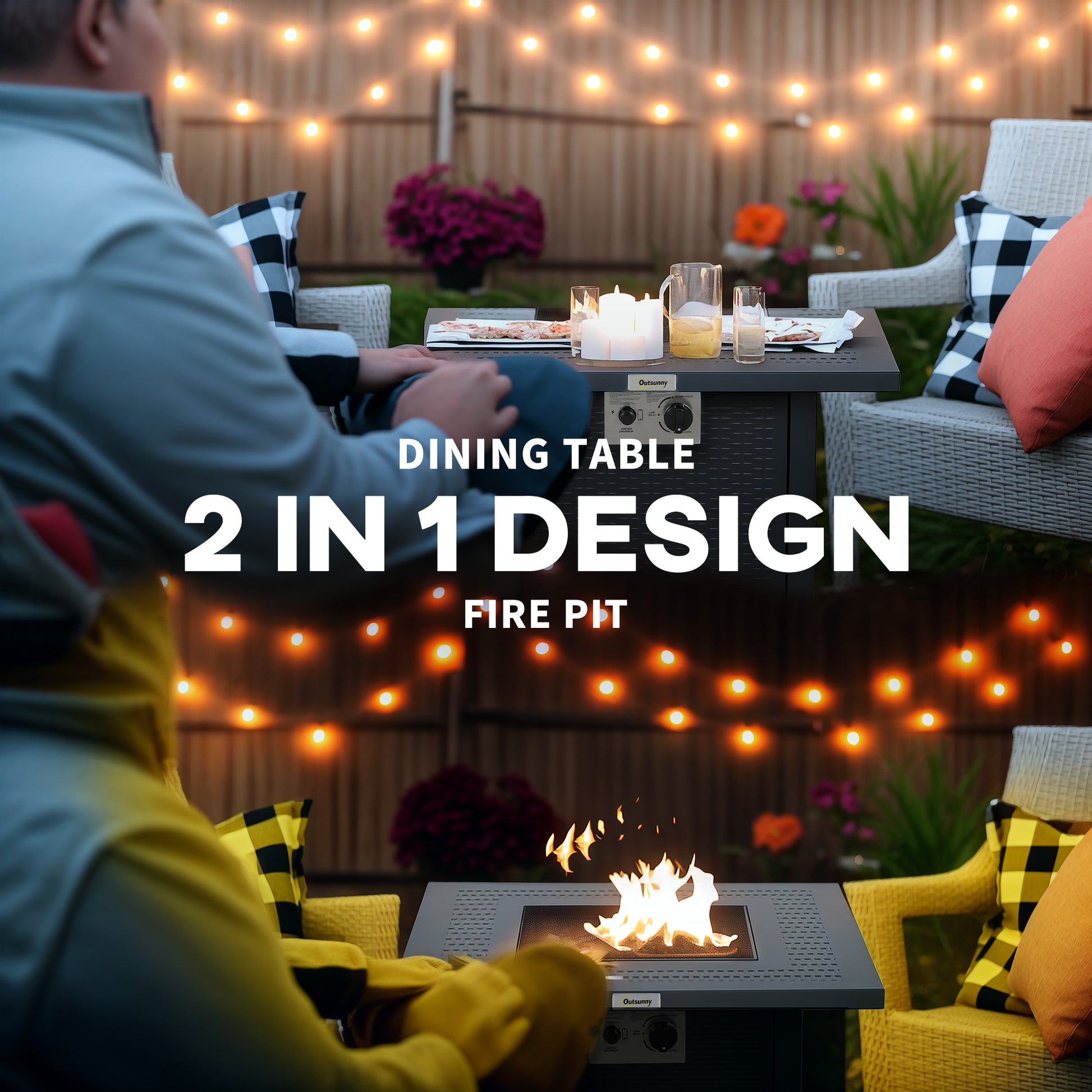 Enjoy garden warmth and ambiance all year-round with this Outsunny fire pit table. The rattan-effect design is stylish, looks great matched with other furniture. The tabletop is fitted with a centre fire pit - the 40,000 BTU burner is powerful and produces a clean smokeless burn. The flame can be adjusted too. The thermocouple closes the valve if the flame goes out for safety - no leaking gas. Lid included to turn into a standard table when needed.