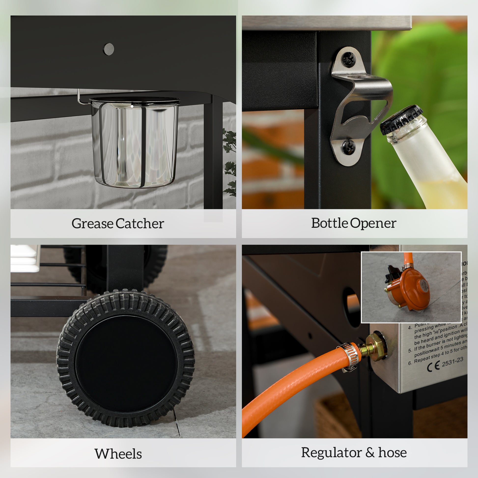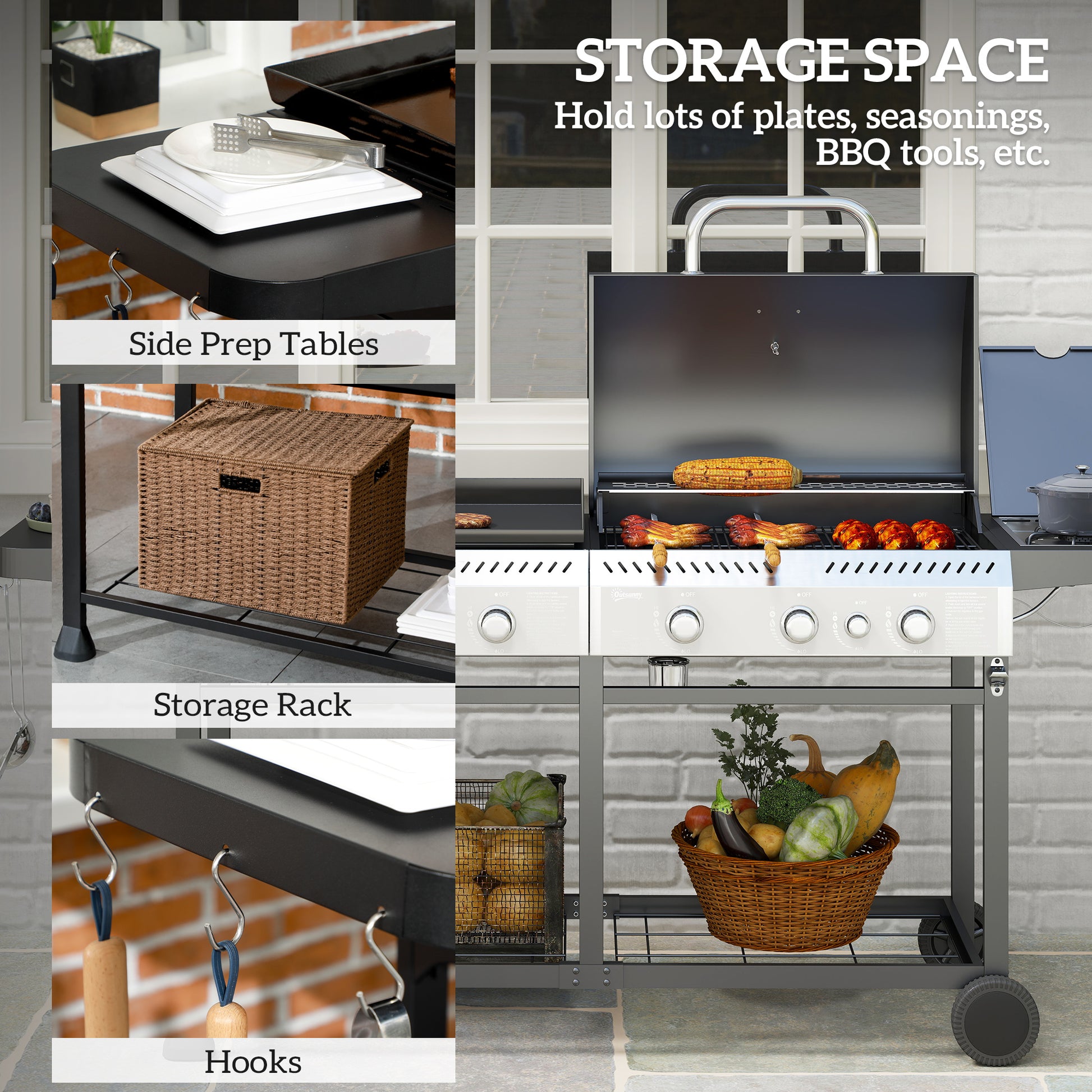 - Weight Capacity: (grill grate) 10 kg, (bottom shelf) 20 kg, (side shelf) 5 kg