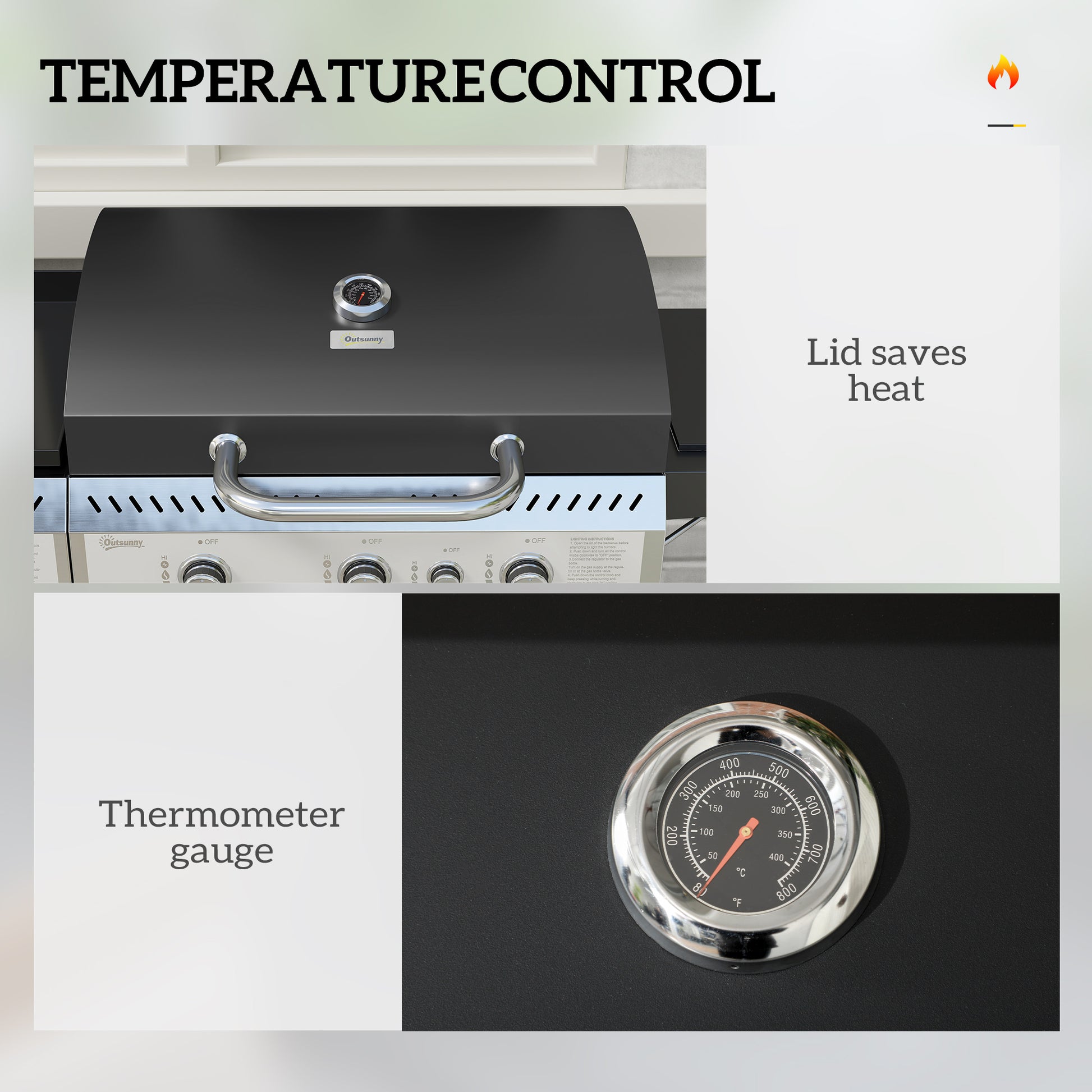 Sizzle and sear like a pro with this Outsunny deluxe BBQ. The two-in-one design combines a gas bbq and plancha grill. The 5565 cm² cooking surface is large enough to cook 12-20 servings. Gas grill features a lid: control the smokiness, with the thermometer to see inside temperature easily. Use the side burner to add extra sizzle. Complete with two wheels to move around easily.