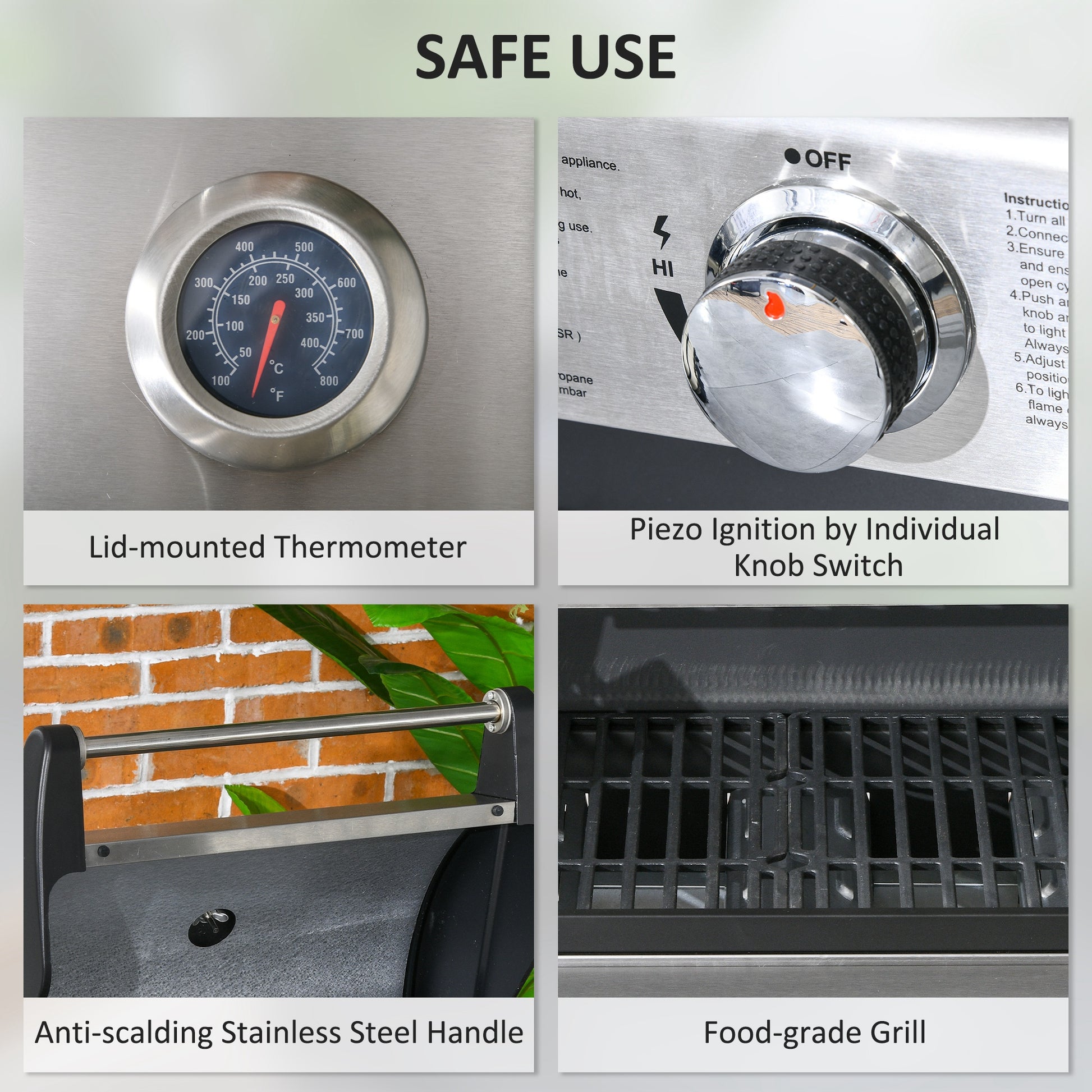 Outsunny Gas Barbecue Grill 3+1 Burner Garden Smoker BBQ Trolley w/ Side Burner Warming Rack Side Shelves Storage Cabinet Piezo Ignition Thermometer Stainless Steel + Metal