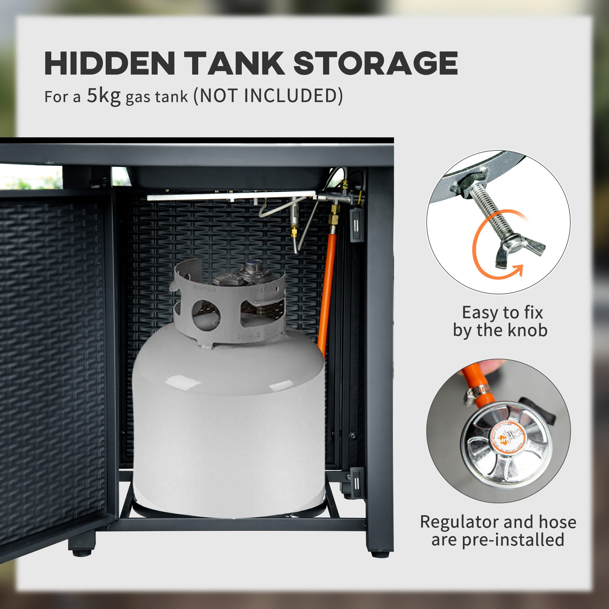 Enjoy garden warmth and ambiance all year-round with this Outsunny fire pit table. Rattan-effect design is stylish, looks great matched with other furniture. The tabletop is fitted with a centre fire pit - the 40,000 BTU burner is powerful and produces a clean smokeless burn. The flame can be adjusted too. The thermocouple closes the valve if the flame goes out for safety - no leaking gas. Complete with a mesh guard, protecting against flying sparks.