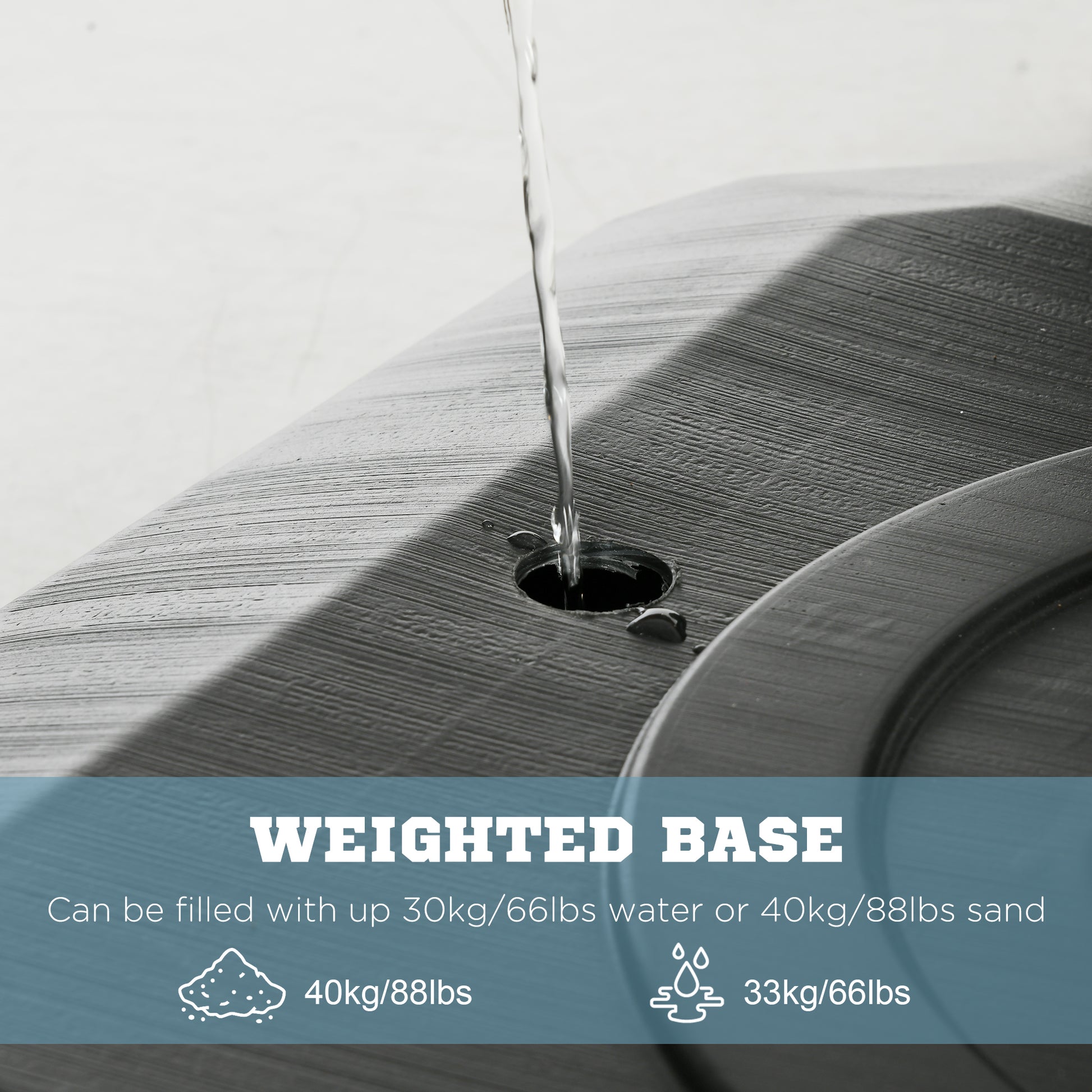 - Base capacity: 30kg water or 40kg sand