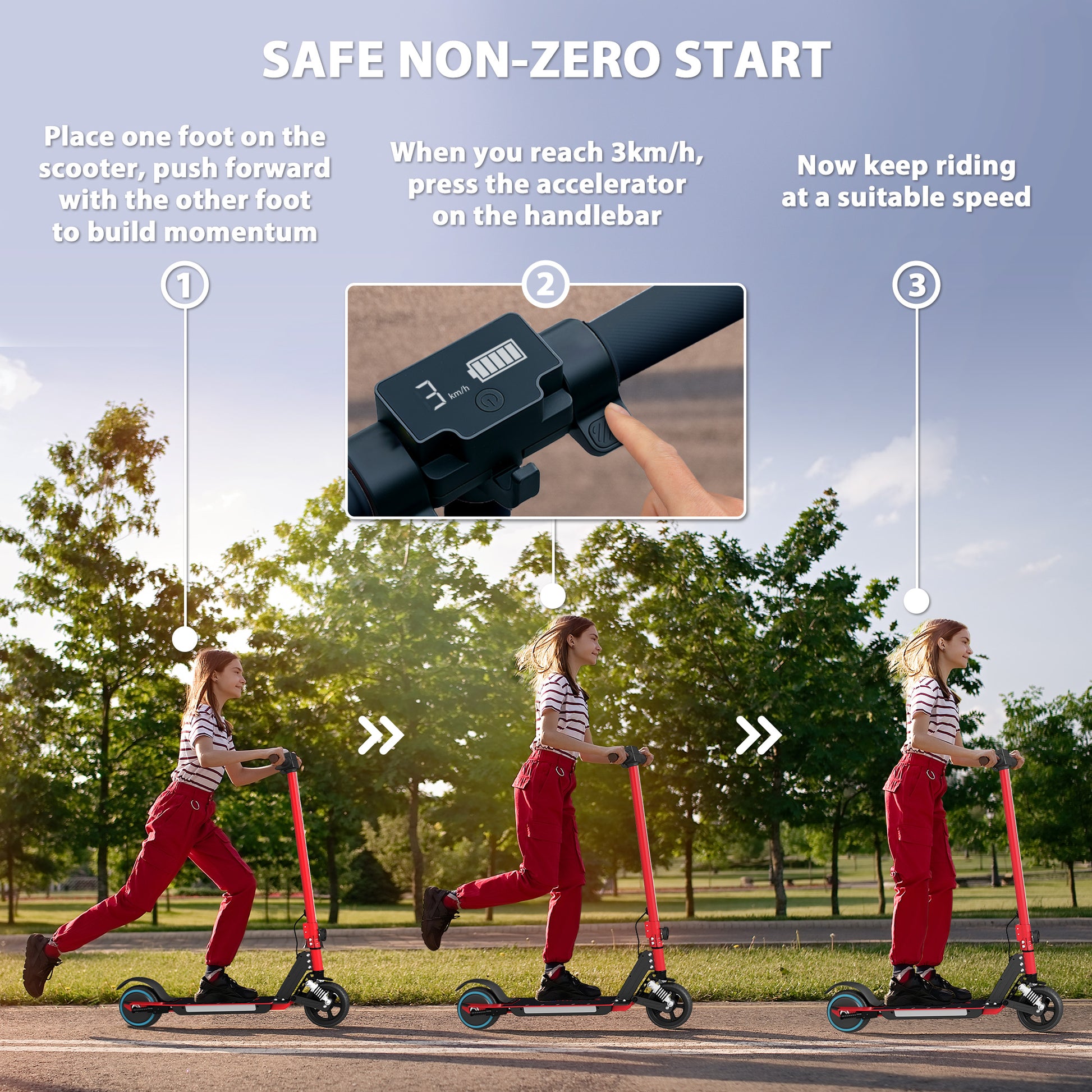 - Thumb-control throttle enables speeds up to 14km/h
